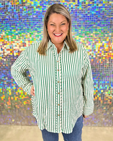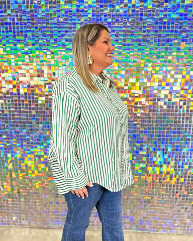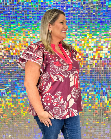 Color block v-neck short sleeve collared top featuring pocket at bust and button detailing at back. Unlined. Woven. Non-sheer. Lightweight. Small: ...