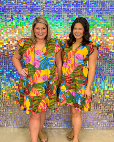 Get ready to sizzle in the Catalina Mini Dress! This hot pink dress features a vibrant green floral print and short sleeves for a playful look. Plu...
