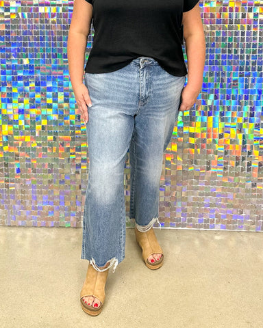 Our mid rise garment dyed wide leg crop jeans combine style and functionality seamlessly. Designed with a flattering mid-rise waist and wide legs, ...