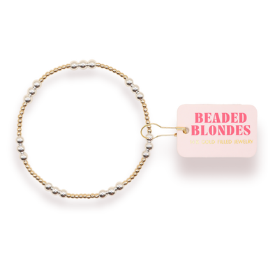 Beaded Blondes stackable beaded bracelet. 14K gold filled & sterling silver on elastic string. Handstrung in College Station, Texas. Sourced in...