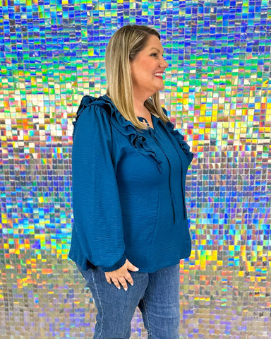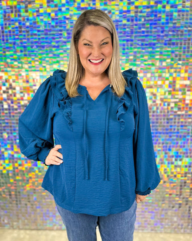 Indulge in elegance and sophistication with our Renaissance Top in Dark Teal. This stunning top features billowing long sleeves, a flattering v-nec...