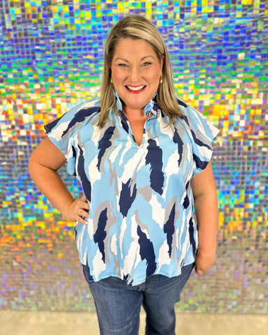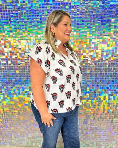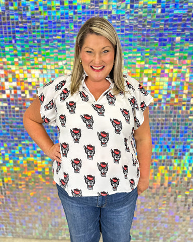 This blouse is the best combination of feminine details and a bold print in your team colors. Featuring a satin fabrication, ruffle mandarin colla...
