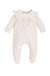 Pink pointelle footed sleeper with boucle bow embroidery. Includes built-in scratch protector hand cuffs and inner leg snaps.