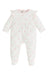White cotton rib footed sleeper with ruffle shoulders and bows at ankles. Includes built-in scratch protector hand mitts and inner leg snaps.