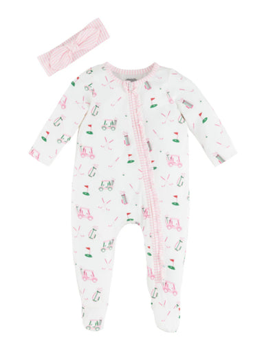 The Golf Baby Sleeper Set is a charming 2-piece ensemble consisting of a ruffle footed sleeper made from a cozy blend of 95% cotton and 5% spandex...