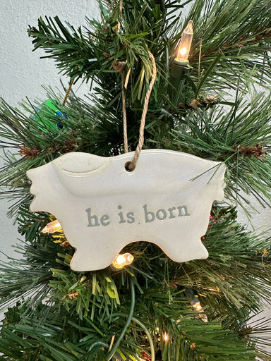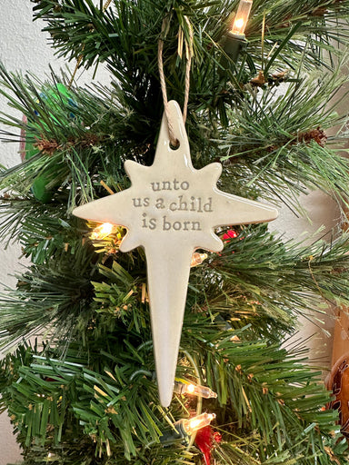 Milk glazed textured stoneware figural ornament with antique wash. Available in six styles: Oh Holy, He is Born, Angel, Three Wise, Star & C...