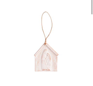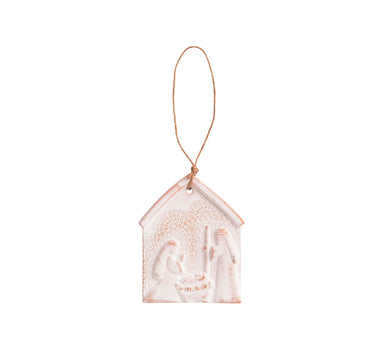 Terracotta ornament features layered Nativity scene icon and pressed lace textural detail. Twine hanger. Dimension: 3 3/4" x 3 3/4" Material...
